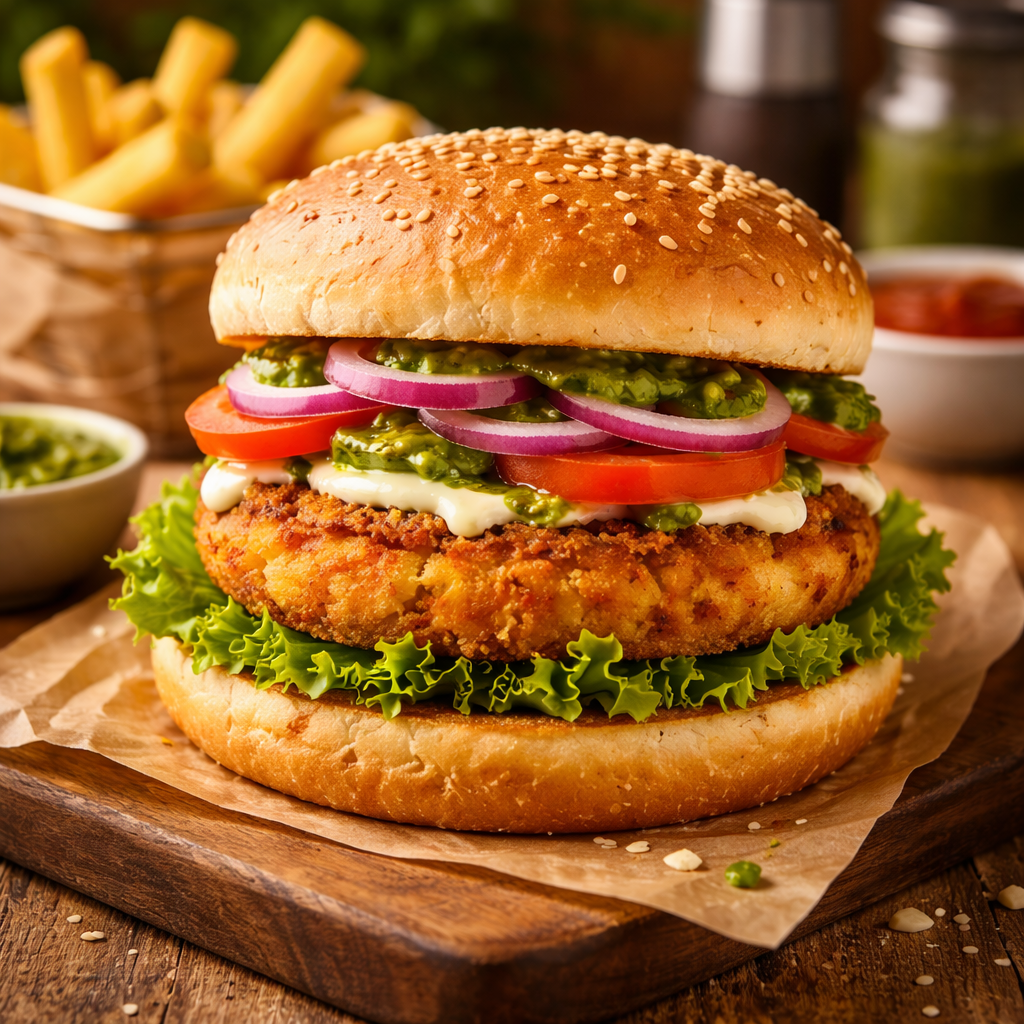 Grab our crispy Aloo Tikki Burger from OrganicFreshIndia Cafe — fresh, filling, and available at a reasonable price.